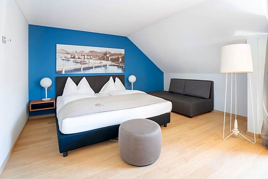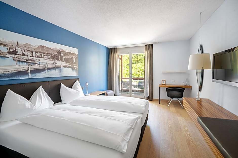 Some of the bright and modern rooms have a balcony overlooking Lake Lucerne and the mountains.